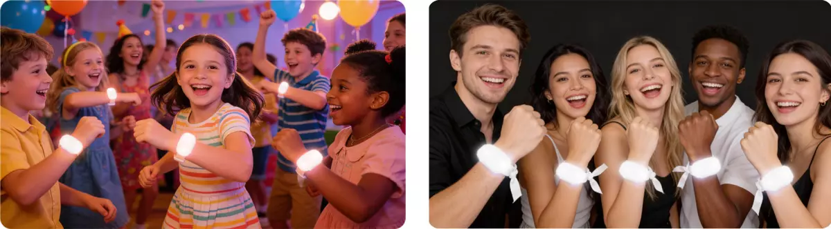 Pulseras ecológicas con correa de tela y 2 LED brillantes. Perfectas para crear una experiencia envolvente que hará las delicias de su público.